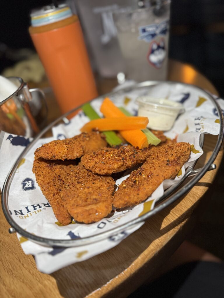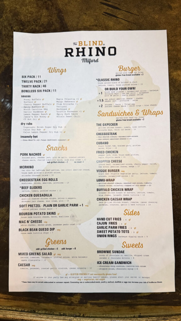 The Blind Rhino serves delicious comfort food and craft beverages, including a very impressive selection of the latest seasonal brews from all of your favorite local breweries. Guests can expect a similar menu to their other locations including our favorite Togarashi (boneless) wings, McRhino and Cheesesteak Egg Rolls. They feature special “Burgers of the Month” as well as “Wings of the Month” in addition to seasonal cocktails and their rotating draft beers. Blind Rhino has won over 40 (as of 2026) awards for their wings. They’ve won awards in Connecticut, Maine, New York (Buffalo, Westchester, Hudson Valley), Rhode Island & New Jersey including 13 trophies at the National Buffalo Wing Festival in Buffalo, NY highlighted by:ย Best in Show Wing in 2021 for Plum Sriracha, back to back wins in 2021 and 2022 for Traditional Hot, and 3rd Place Best in Show in 2025 for Strawberry Jalapeรฑo BBQ, and also top 3 Festival Favorite in 2025!