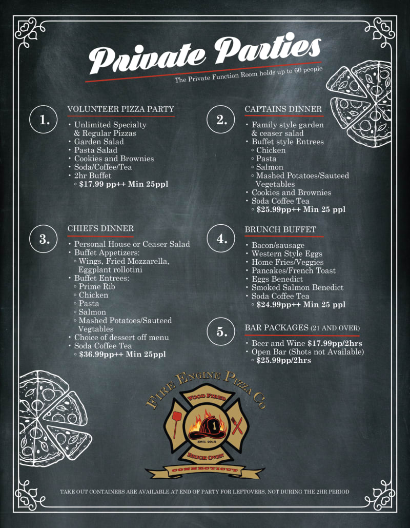 With reclaimed barn-wood, hickory floors, and endless artifacts donated from local Fire Departments, Fire Engine Pizza Co. exudes an early American ambiance with intricate detail from top to bottom. The rectangular bar is situated in the center of one half of the establishment, creating an inviting social environment that serves all the classics – plus seasonal cocktail specials throughout the year. The remaining half emanates a family- friendly atmosphere with a brick oven backdrop, creating a dining experience that is unmatched. There is a brand new private room space as of the Fall of 2023.